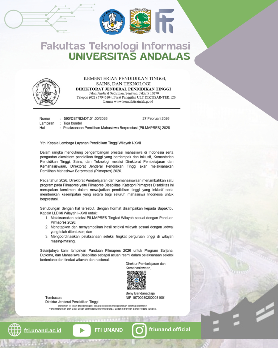 Dalam rangka mendukung pengembangan prestasi mahasiswa Indonesia serta memperkuat ekosistem pendidikan tinggi yang berdampak dan inklusif, Kementerian Pendidikan Tinggi, Sains, dan Teknologi melalui Direktorat Pembelajaran dan Kemahasiswaan, Direktorat Jenderal Pendidikan Tinggi akan menyelenggarakan Pemilihan Mahasiswa Berprestasi (PILMAPRES) Tahun 2026.